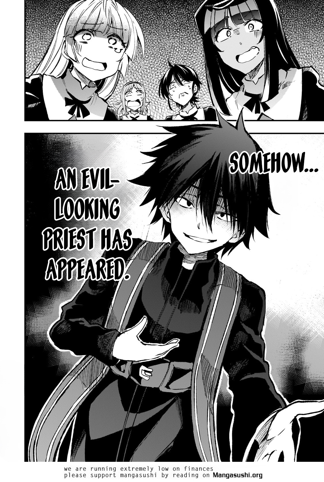 An evil looking priest with an harem of sexy nuns.